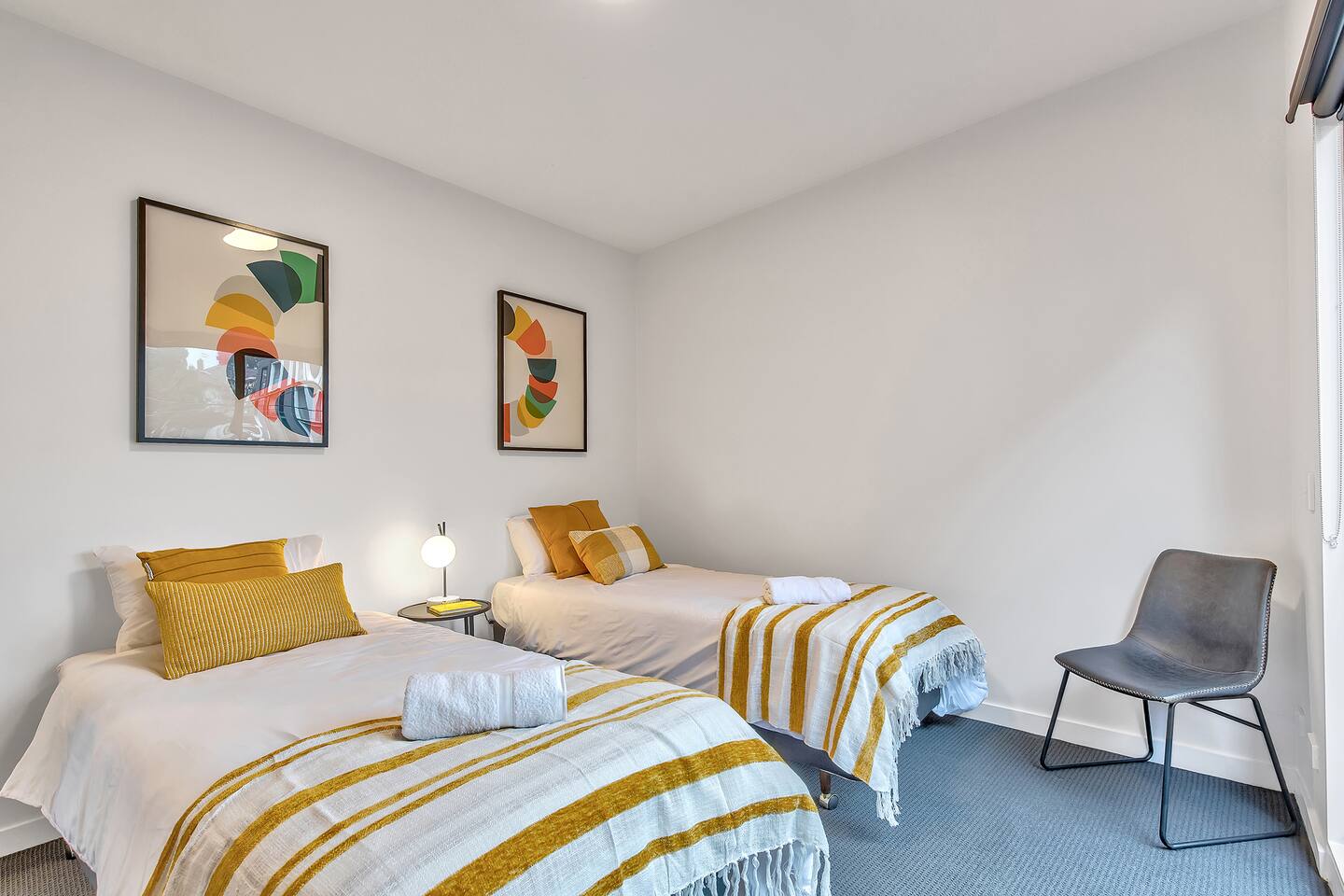 BEDROOM LAYOUT - SLEEPS 6 GUESTS Bedroom 1: 1 x Queen bed Bedroom 2: 2 x Single Beds (can be pushed together to make a King bed) Common area/loungeroom: 1x fold-out sofa bed (linen in cupboard) All linens and towels will be included; however, lost or damaged linen/towels may incur costs.