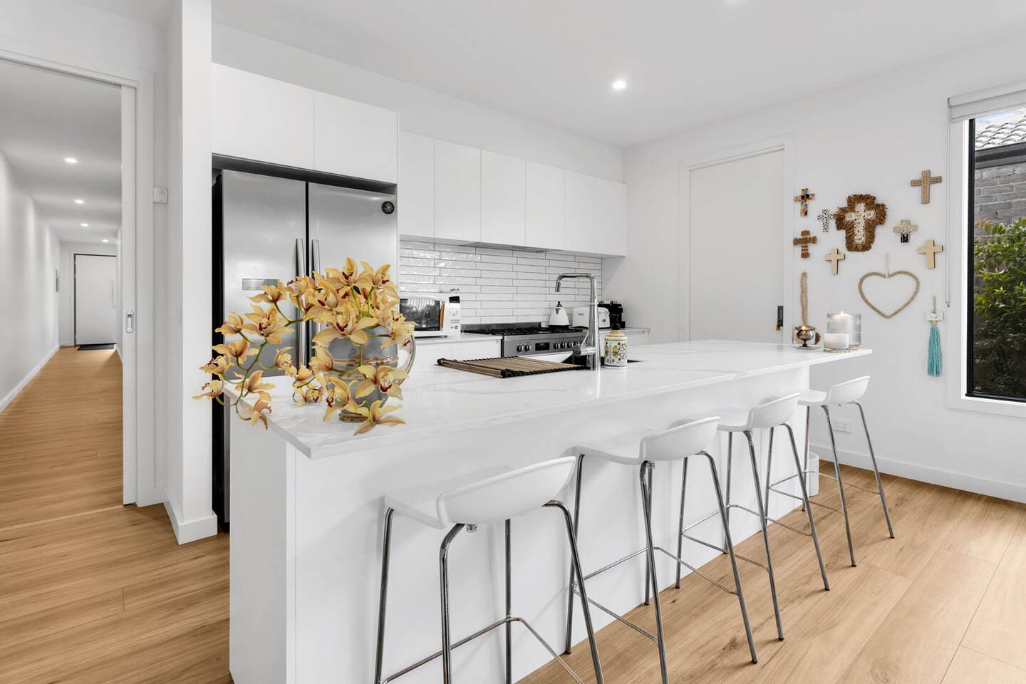 This home has everything you could dream of for a relaxing holiday. The well-equipped kitchen boasts all the essentials, including a double oven, microwave, and a delightful Espresso coffee machine for your morning brew. Entertainment options abound with Smart TVs, a stereo, and a library of games for all ages. Outdoors, you'll find cozy chairs and a covered BBQ area, making al fresco dining a breeze. Families will appreciate thoughtful touches like kids' toys, high chairs, and a selection of books. Stay connected with Wi-Fi, and enjoy the convenience of a laundry, ample parking, and an outdoor gas heater for those cooler evenings. The bathrooms offer pure relaxation with a bathtub and separate showers. With comfortable bedrooms designed for a peaceful night's sleep, they provide the perfect retreat after a day of seaside fun. Albert Samian Retreat is a modern, impeccably appointed townhouse and your gateway to coastal bliss. Explore nearby attractions, including shopping, schools, hospitals, golf courses, the Peninsula Hot Springs, and the captivating Capel Sound foreshore beach. Secure your spot at Albert Samian Retreat and create cherished memories with your loved ones. The house is in a residential street with surrounding permanent tenants, so we only rent to mature guests who will remain respectful to our neighbours. The house will be used for relaxation-style holidaying; loud parties are prohibited.