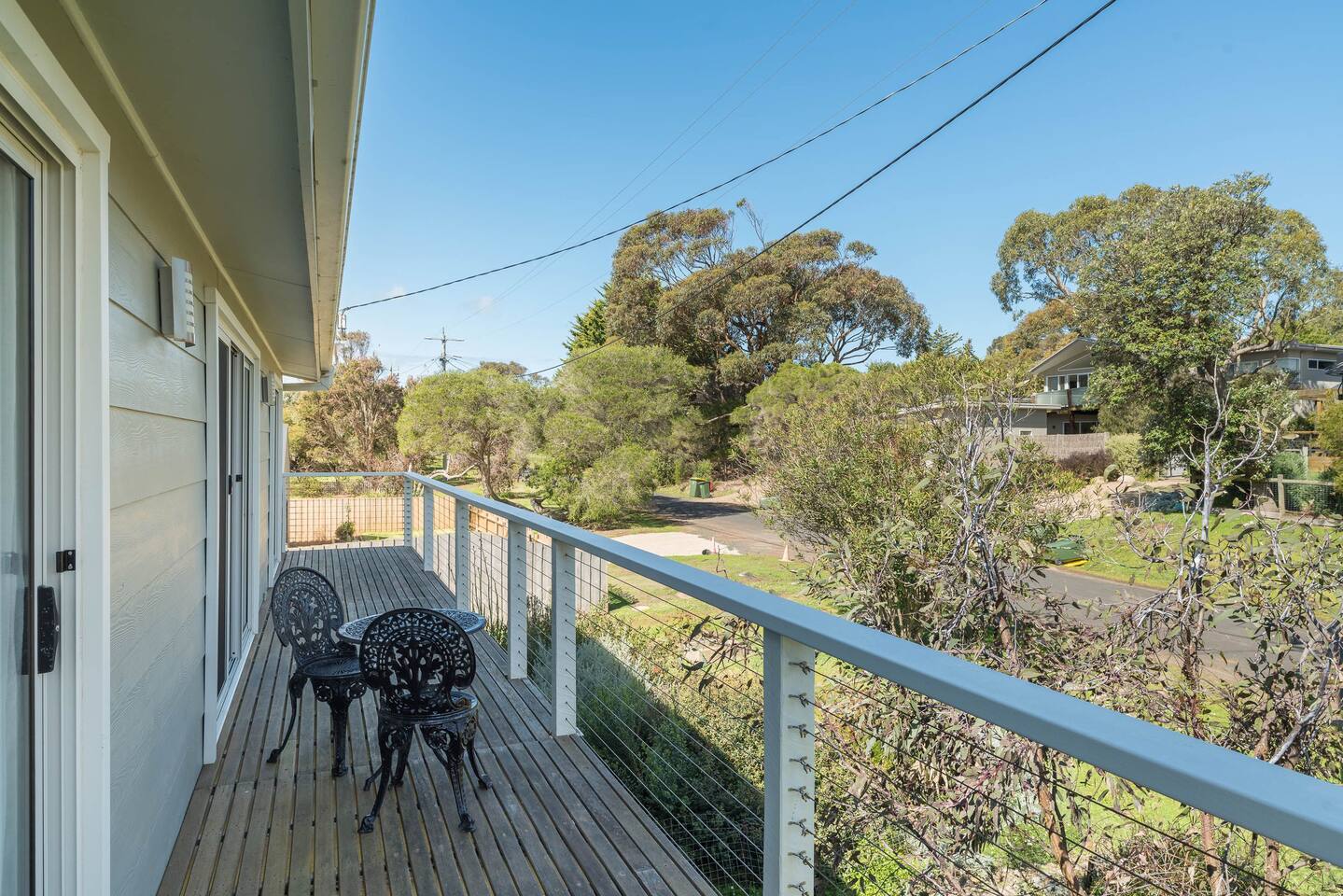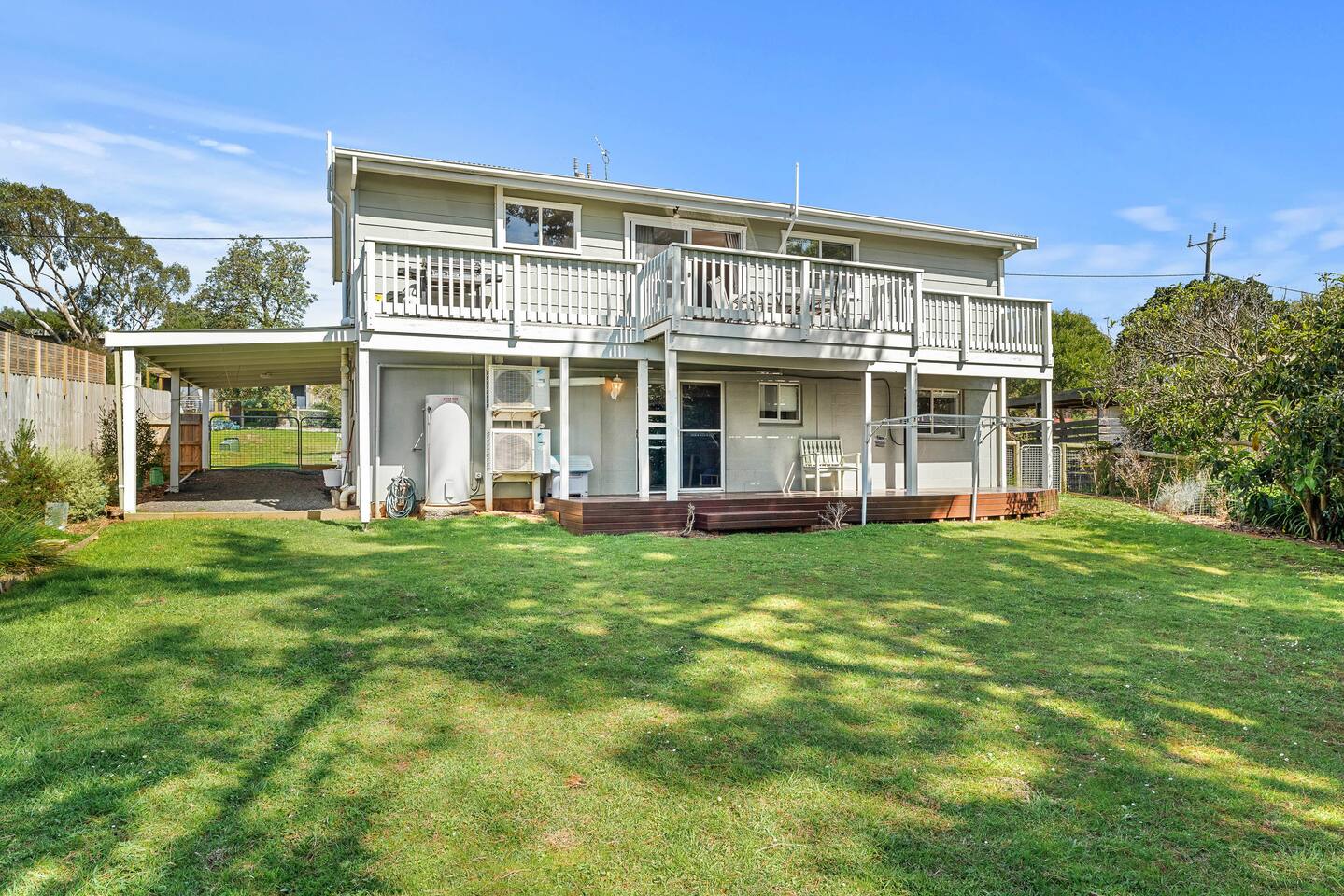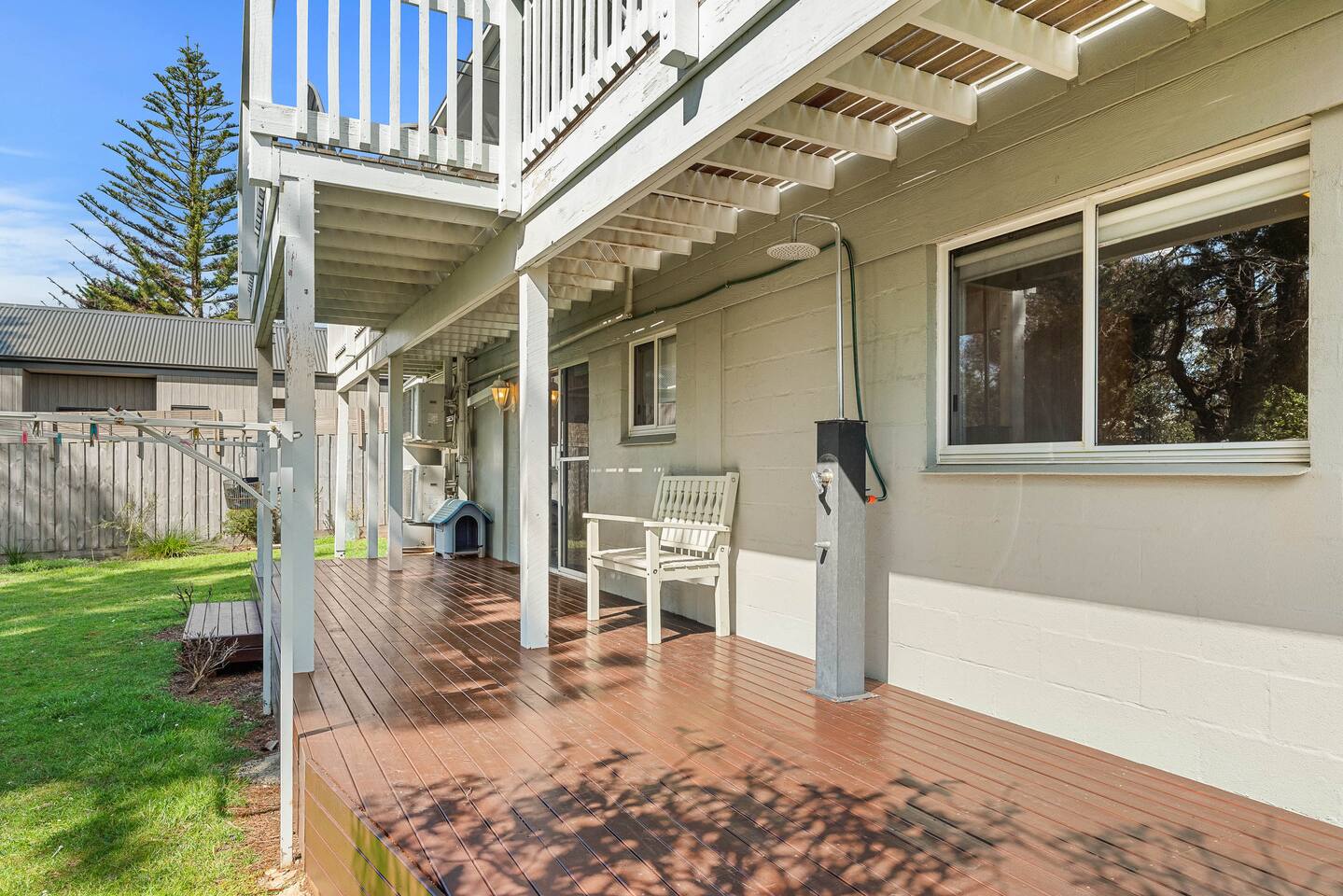 Bedrooms: There are six good-sized bedrooms. The home has 10 beds and sleeps up to 15 guests: Upstairs: Bedroom 1: 1 x Queen bed Bedroom 2: 1 x King bed Bedroom 3: 1 x Queen bed Downstairs: Bedroom 4: 1 x Tri-Bunk (Double bottom & Single top) and 1 x cot Bedroom 5: 1 x Bunk beds (Single bottom & Single top) Bedroom 6: 1 x Bunk beds (Single bottom & Single top) Downstairs living area: Queen size sofa bed Bathrooms: A family bathroom upstairs has a shower over the bath and a separate toilet. Downstairs, there is another shower and a separate toilet in the laundry room with a huge 10kg washing machine. Living areas: The two separate living rooms are equipped with comfy couches and TVs so the kids and adults can relax and unwind in their own spaces. The house has a homely, lived-in feel, so you can enjoy your time away without stressing about leaving marks on fancy new furniture. Kitchen and dining: The fully equipped kitchen makes catering for big groups easy. It features modern appliances, plenty of crockery and cookware, a dishwasher, and an ALDI coffee machine for morning brews. Heating and cooling: This has an efficient split system for heating and cooling upstairs and downstairs. Ceiling fans keep the upstairs bedrooms cool on summer nights, and large windows take advantage of sea breezes. Outdoor area: The two north-facing decks are perfect for BBQs and soaking up the sun, while the south-facing deck offers a cooler space to relax. There’s a huge backyard for the kids and pets with a huge trampoline, space for backyard cricket and an outdoor shower for rinsing off after the beach. LINEN For flexibility and value, we offer a range of linen options: 1. BYO LINEN - All beds (apart from the sofa bed) have pillows and doonas with doona covers. You need to bring fitted sheets, flat sheets, and pillowcases. Also, don’t forget your beach towels, bathroom towels, and tea towels. 2. LINEN SUPPLIED - We can supply pillowcases, fitted and flat sheets for $30 per stay per bed (you’ll still need towels). 3. TOWELS SUPPLIED—We offer a towel set option of $10 per person, including bath towels, beach towels, and one set of 2 tea towels for the house. Please let us know if you need a linen or towel set for your stay.
