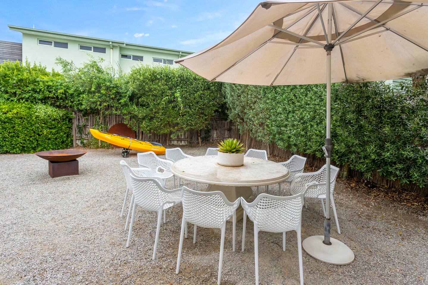 This lovely home offers the following: 3 bedrooms with robes 2 bathrooms Fully equipped kitchen with fridge with ice machine, microwave, sandwich maker, dishwasher and nutribullet Dining for 8 guests Unlimited WIFI and 2 TVs (1 in bedroom 1) Netflix Nespresso coffee machine (BYO pods) Relaxing egg chairs Washer and dryer Parking space available (Please note, the garage is not accessible. ) Pet-friendly and fully fenced Lovely coastal backyard Outdoor table and setting BBQ Kayak Beach items such as beach trolly and beach chairs Outdoor sunbeds x 2 Large esky for the beach Firepit outside (BYO wood) Walking distance to the beach HEATING/COOLING Electric fireplace Electric heaters in each bedroom Fans on the ceiling (2 in the loungeroom and 1 in each bedroom) Dyson air-conditioning