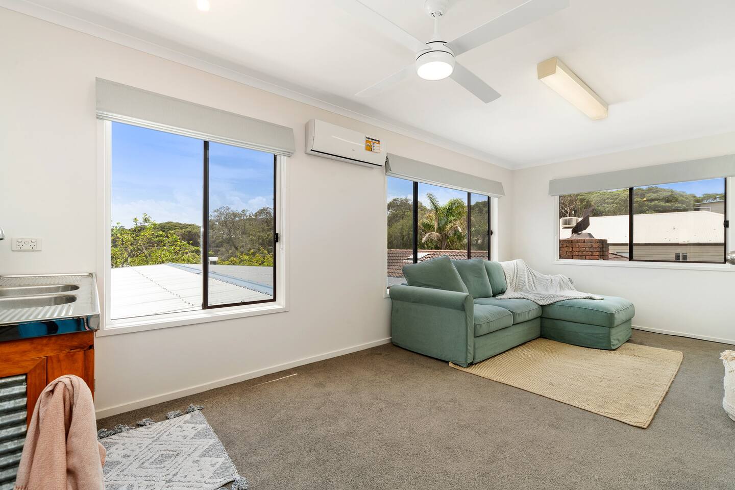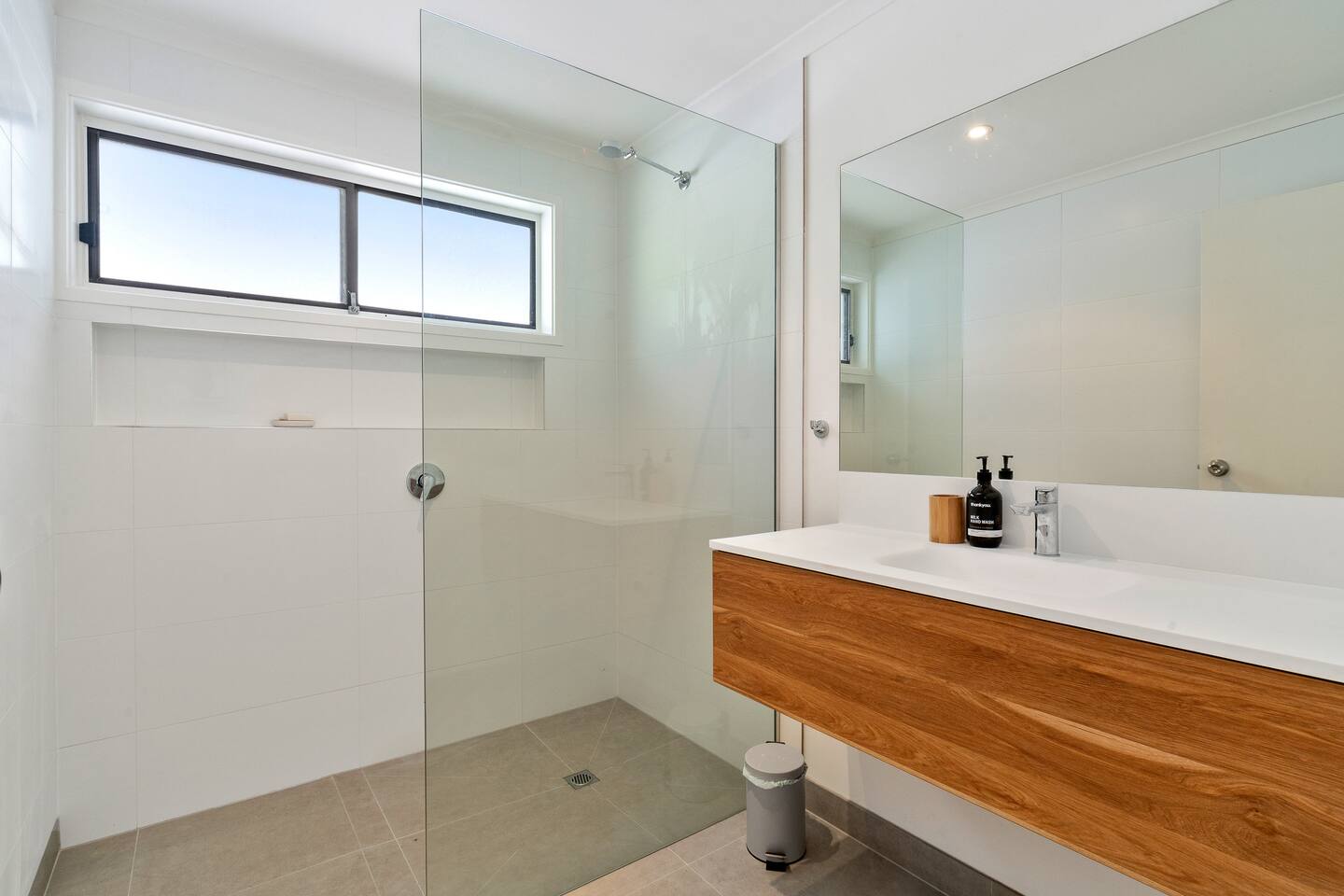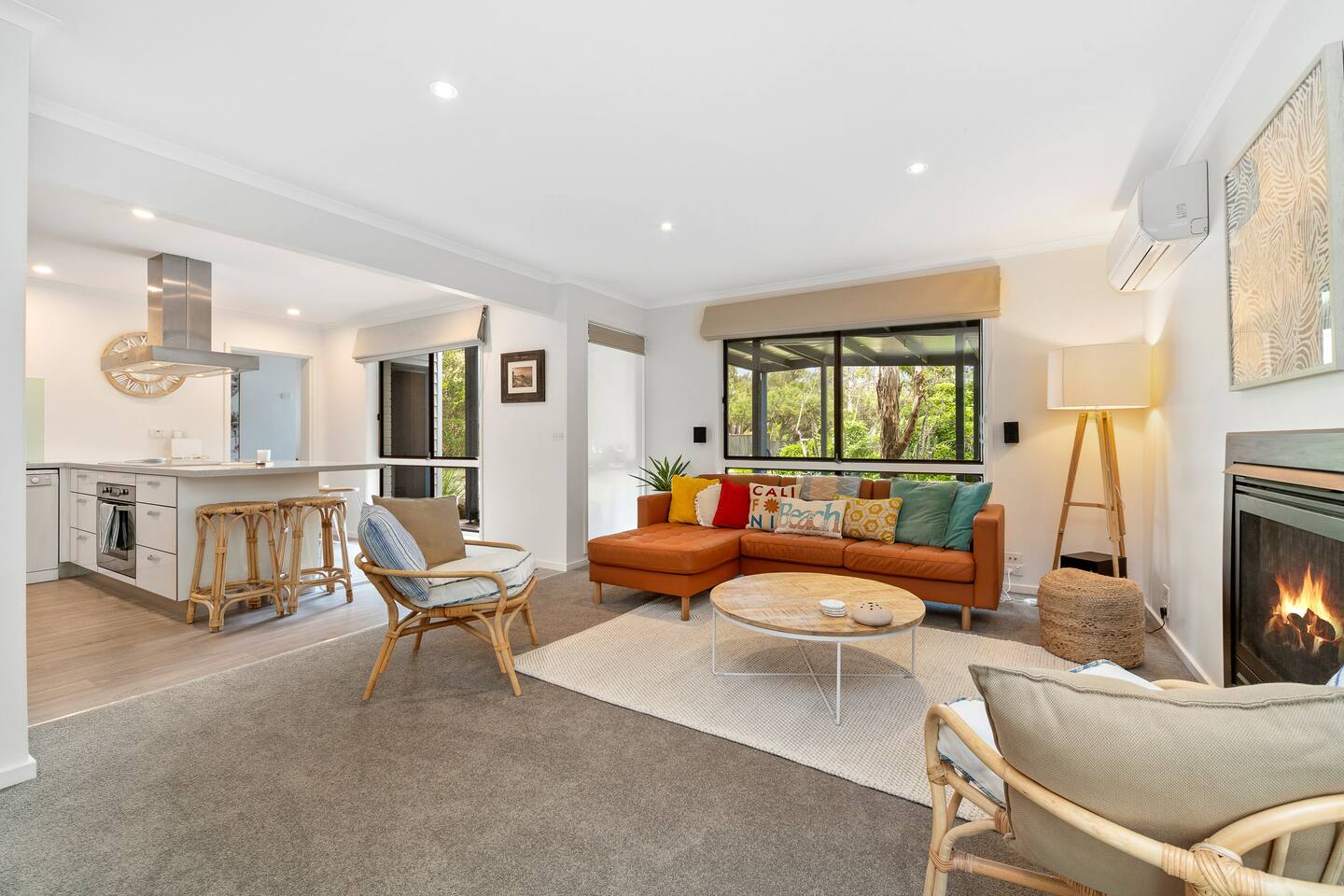 Warm, stylish and has lots of room to entertain you will enjoy the space and light throughout. La Maison Ver La Mer is a modern and large home with an open plan living, kitchen and living area that leads out to an outdoor entertaining area where family and friends can wine and dine in style or even have a BBQ. The open-plan kitchen has all your cooking essentials. The coastal ambience extends to the luxury lounge, including a wide-screen smart TV, together with a split system, and a cosy gas log fireplace. Enjoy a meal in the enclosed indoor space, complete with a spacious dining table perfect for gathering and sharing moments. This spacious home accommodates 12 guests across 5 bedrooms and has 2 bathrooms. (Bedroom 4 does not have a door). The main level has a queen bedroom and 2 bedrooms with tri bunks (double bottom / single top), plus an additional trundle bed in the second bedroom. Upstairs is a fabulous parents' retreat, offering a double size bedroom, a single bedroom (without a door), an ensuite, and a living room with a split system and a TV. The modern family bathroom is on the main level. Expansive alfresco dining, featuring a 14 seat cover dining suite, cosy lounges, an enclosed server room, and a gas BBQ. Surrounded by a fully enclosed backyard. One of the best private outdoor entertaining areas. Please note there is no dining table inside. Whether you’re looking for a relaxing beach getaway to soak up the sun or chill in the great-sized backyard and patio area there is something for everyone. The house is in a residential street with surrounding permanent tenants so we only rent to mature guests that will remain respectful to our neighbours. The house is to be used for relaxation-style holidaying, loud parties are prohibited.
