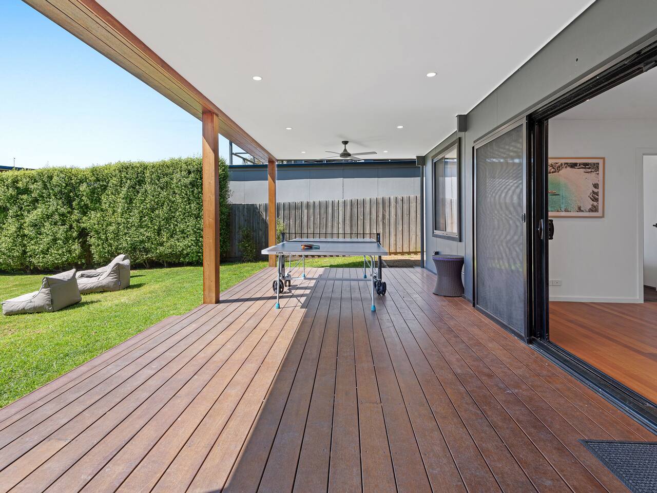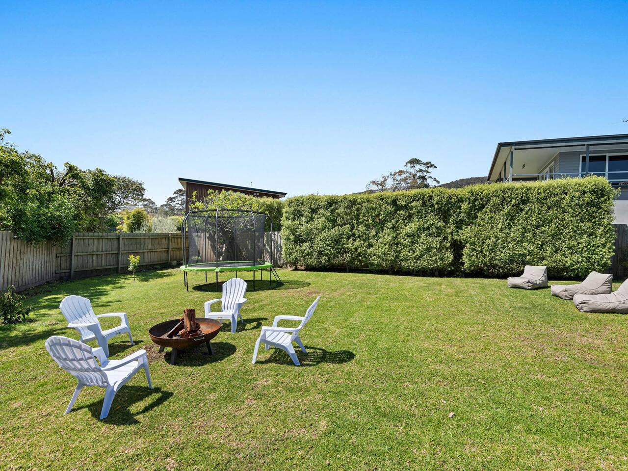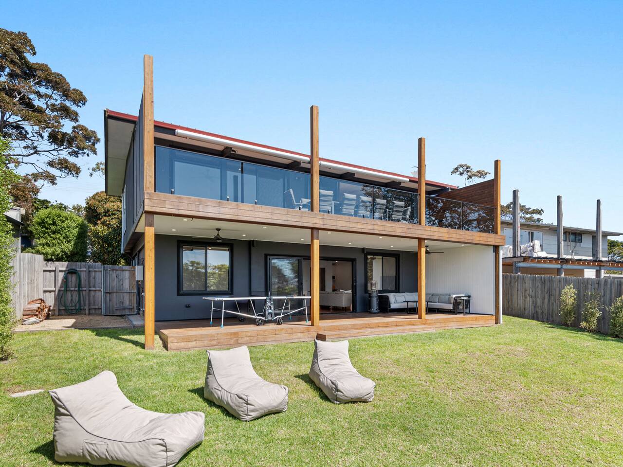 This lovely home offers: 2 story home Pet friendly Fully fenced Fully equipped kitchen - no pantry available Dishwasher and coffee machine (Nespresso pod) - BYO pods Gas log fireplace 2 lovely bathrooms, both with baths Dining table for 8 guests WIFI Study area Highchair 2 digital/smart TVs Games and books Blackout blinks Table tennis Fooseball Outdoor entertainment area with decking and lounge beach chairs Outside couches with gas heating and outdoor fan Balcony with dining for 12 guests and electric awning Euro laundry with washer, dryer and iron Firepit (BYO wood) Parking for boats The garage is not for use HEATING & COOLING Split System in the lounge upstairs Split system in the upstairs bunk room Gas log upstairs lounge Fans in all bedrooms Outdoor fan Downstairs electric heating 3 electric oil heaters for each bedroom Please note, the home has security cameras outside at the front that looks over the driveway We ask all guests to please clean the BBQ after use, or a $50 fee will be charged.