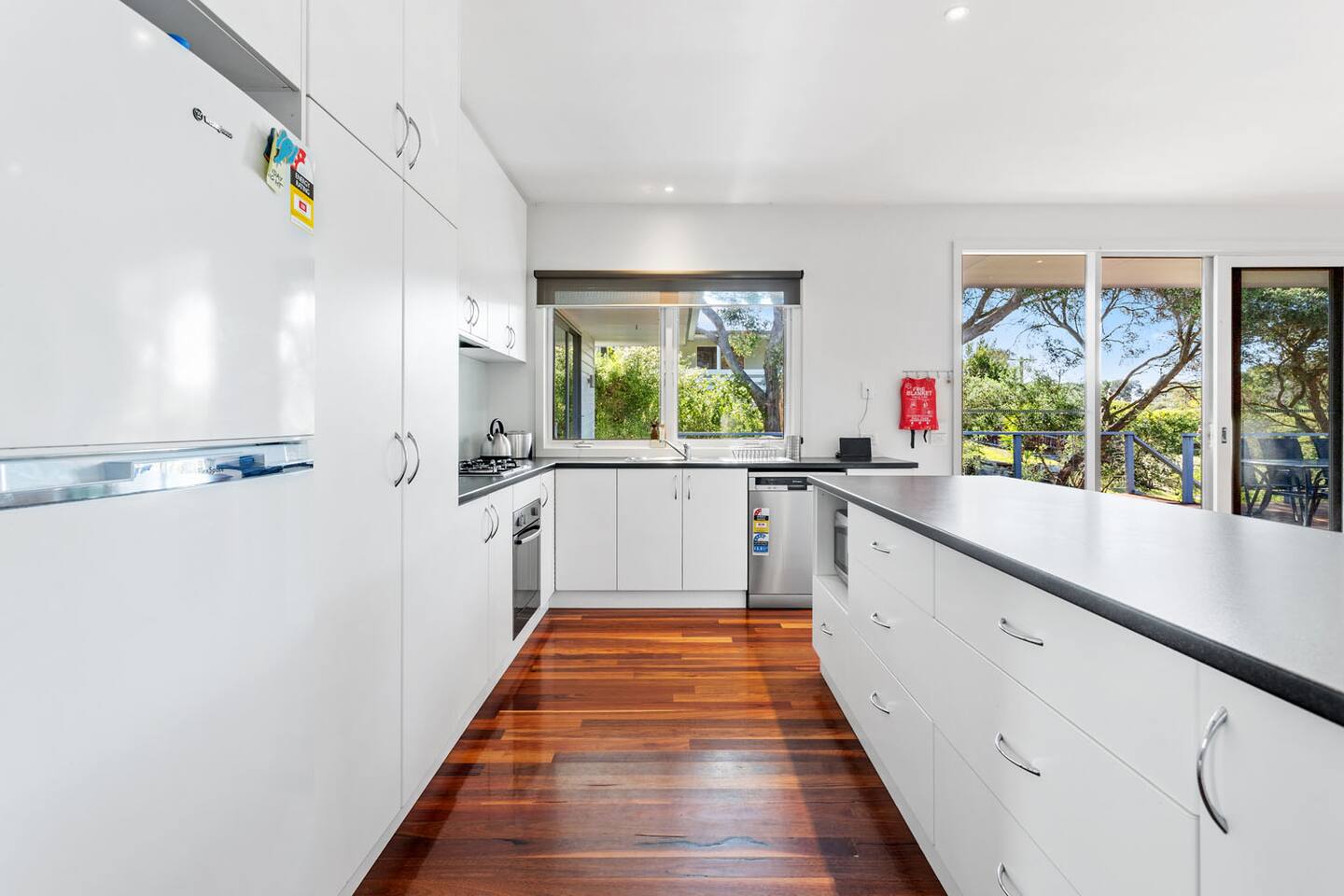 As you arrive, be welcomed by the stunning, lush bushland surrounding this beautiful property. The spacious, fully fenced yard provides a secure, peaceful environment, perfect for pets and kids to roam freely. Step onto the expansive entertaining deck, where you can bask in the sounds of the ocean and enjoy views of the pristine surroundings. The outdoor space is thoughtfully designed for relaxation and al fresco dining, featuring a BBQ and stylish outdoor seating where you can unwind with family or friends. Inside, every corner of the home exudes luxury and comfort. The open-plan kitchen and living area, adorned with polished floorboards and high-end finishes, create a sophisticated yet inviting atmosphere. The gourmet kitchen is a dream, equipped with modern appliances, including a Nespresso coffee machine, oven, dishwasher, slow cooker, toaster, air fryer, and rice maker — everything you need to create memorable meals. The adjoining living area provides a space to relax and enjoy the ambience. In contrast, a second, separate living area offers a retreat for entertainment with a Smart TV and a collection of DVDs, games, and books for all ages. The master suite is a true sanctuary, featuring a plush Queen-sized bed, a spacious walk-in robe, and a luxurious ensuite bathroom. The other bedrooms are equally inviting, offering comfort and ample space for everyone. The family-friendly bathroom includes a deep soaking tub - perfect for unwinding after a day at the beach - and a separate toilet for added convenience. Every detail of the home has been thoughtfully considered, with cozy extra blankets, a hairdryer, and high-quality linens for your comfort. For families, Menzies Backbeach Retreat caters to all ages, offering a highchair and a collection of books for children, ensuring everyone feels at home. With Wi-Fi, ducted heating, and split-system air conditioning, the home provides year-round comfort, no matter the season. This pet-friendly haven is just minutes from Rye’s iconic back beach, where you can enjoy the pristine coastal environment and stunning ocean views. Spend your days exploring the area, or indulge in the tranquillity of the home. Whether relaxing on the deck with a glass of wine or gathering around the BBQ in the lush backyard, every moment at Menzies Backbeach Retreat is designed to make you feel pampered and rejuvenated. With a double carport and ample parking, Menzies Backbeach Retreat offers the ultimate blend of luxury, convenience, and coastal charm. Whether you’re here for a weekend getaway or a more extended stay, this is a place where you can truly relax, recharge, and create unforgettable memories.