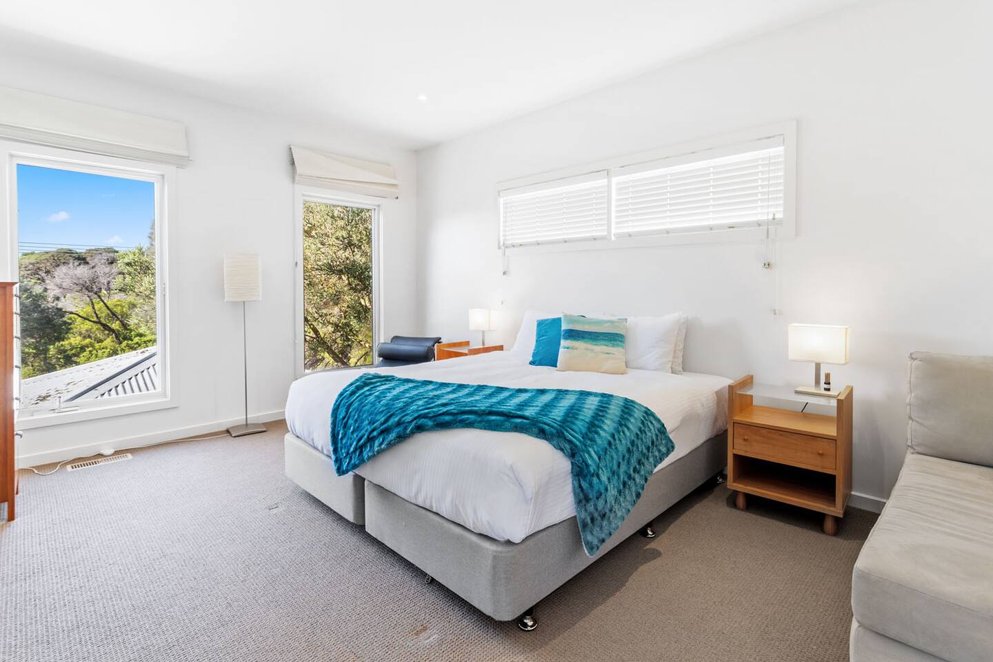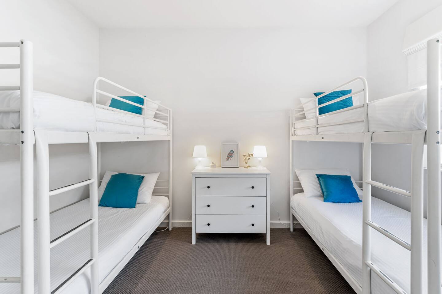 BEDROOM LAYOUT - SLEEP 9 GUESTS Sleeps 9 Bedroom 1 – 1 x King Bed Bedroom 2 – 1 x Queen Bed Bedroom 3 – 2 x Single bunks Second living space – 1 x King Single All linens and towels will be included; however, lost or damaged linens/towels may incur costs.