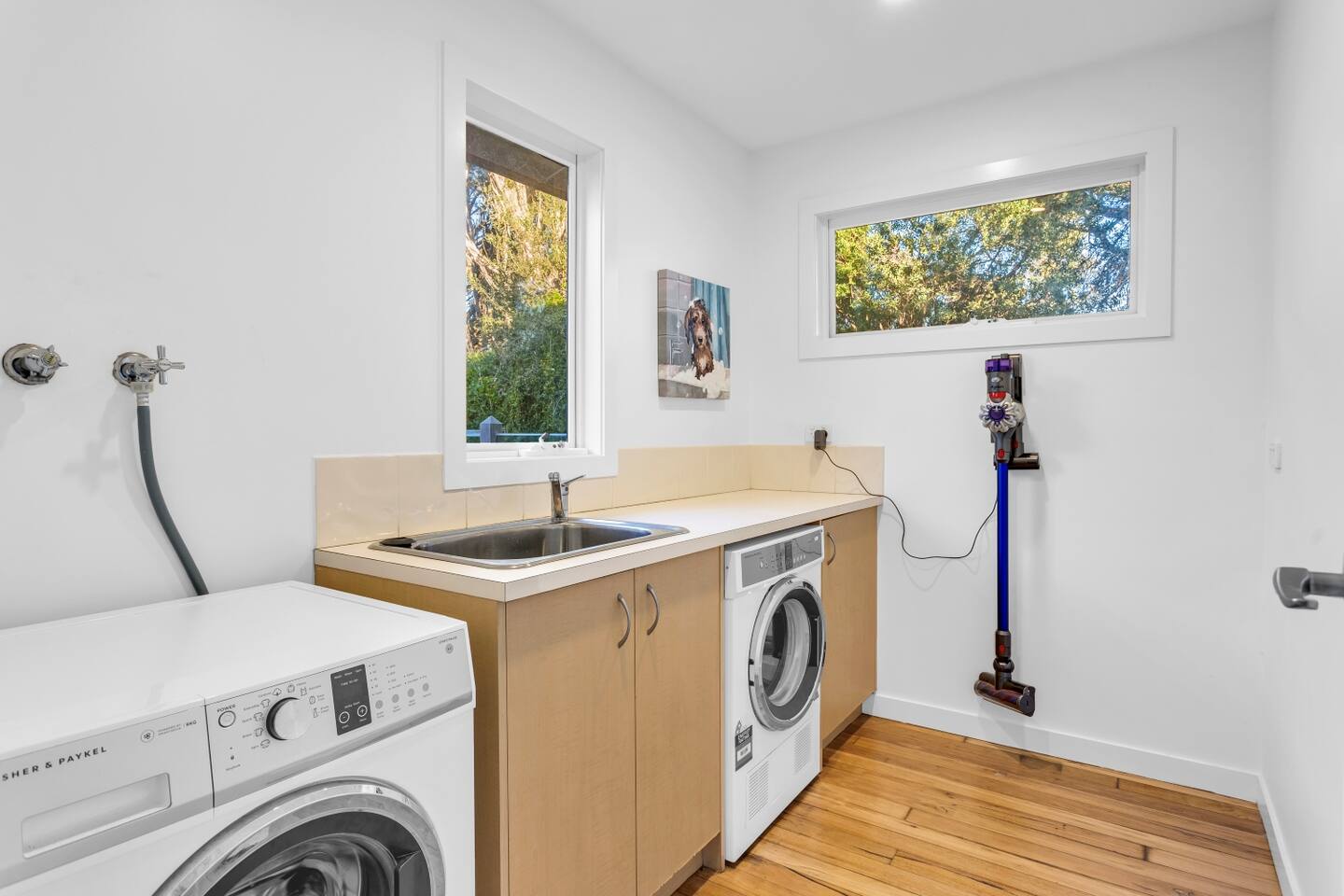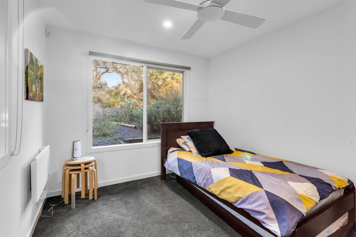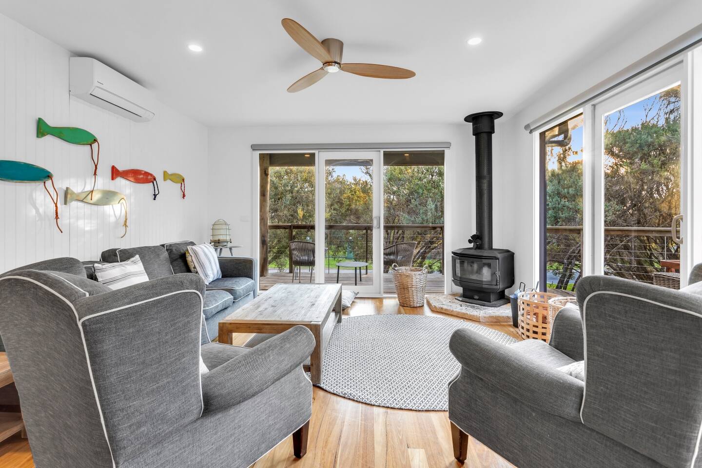 This lovely home offers: 5 bedrooms 2 bathrooms Heating and cooling Dishwasher Microwave Breville Coffee machine - BYO coffee beans Satellite Internet access Large deck area Washing machine Iron Dryer Indoor Fireplace Portable desk and office chair - located in one of the bedrooms Outdoor entertaining area BBQ Firepit Board games HEATING/COOLING Split system in living and dining area Wood fireplace in living area Wall heaters in bedrooms Ceiling fans in bedrooms