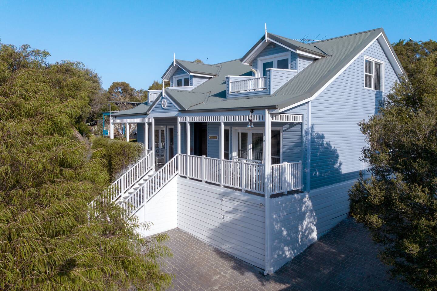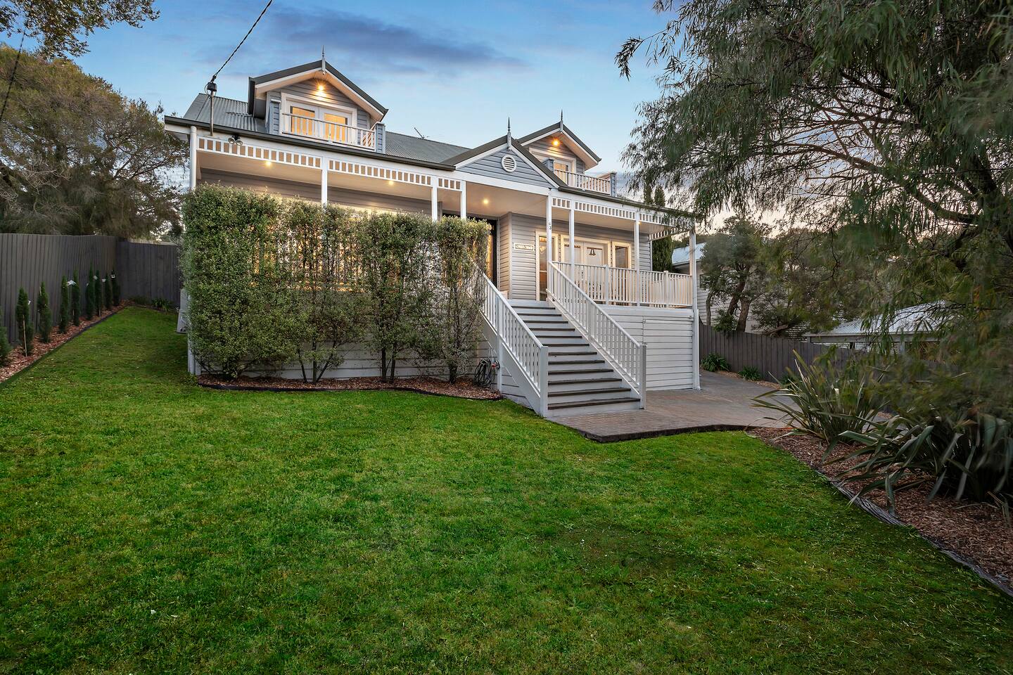 This lovely home Serenity in Rye offers: Sleeps eight guests Under 10 minutes walk to the beach (700 meters) Complete linen and towels provided Four bedrooms - including three bedrooms on the upper level, each with their own balcony Two generous bathrooms including a separate toilet on the main level Modern fully equipped kitchen with sandwich press and deep fryer Dishwasher Laundry with washing machine, dryer, iron and ironing board Landscaped gardens Outdoor entertaining area Large balcony Picture perfect facade with a wide, decked verandah and intricate fretwork Meticulous attention to detail with bespoke cabinetry and gleaming hardwood flooring Spacious interiors that provide a seamless flow throughout the multiple living zones The enormous alfresco area allows for entertainment and relaxation throughout the seasons Set on perfectly manicured grounds with plenty of parking space Please note, that the garage will not be available. Please note: That the garage will not be available The fireplace is not for use Guests can not cook fish or shellfish in the home or BBQ as the owner has anaphylaxis The TV in the main living area does not get "free to air" tv No WiFi HEATING & COOLING Ducted heating Split system heating and cooling