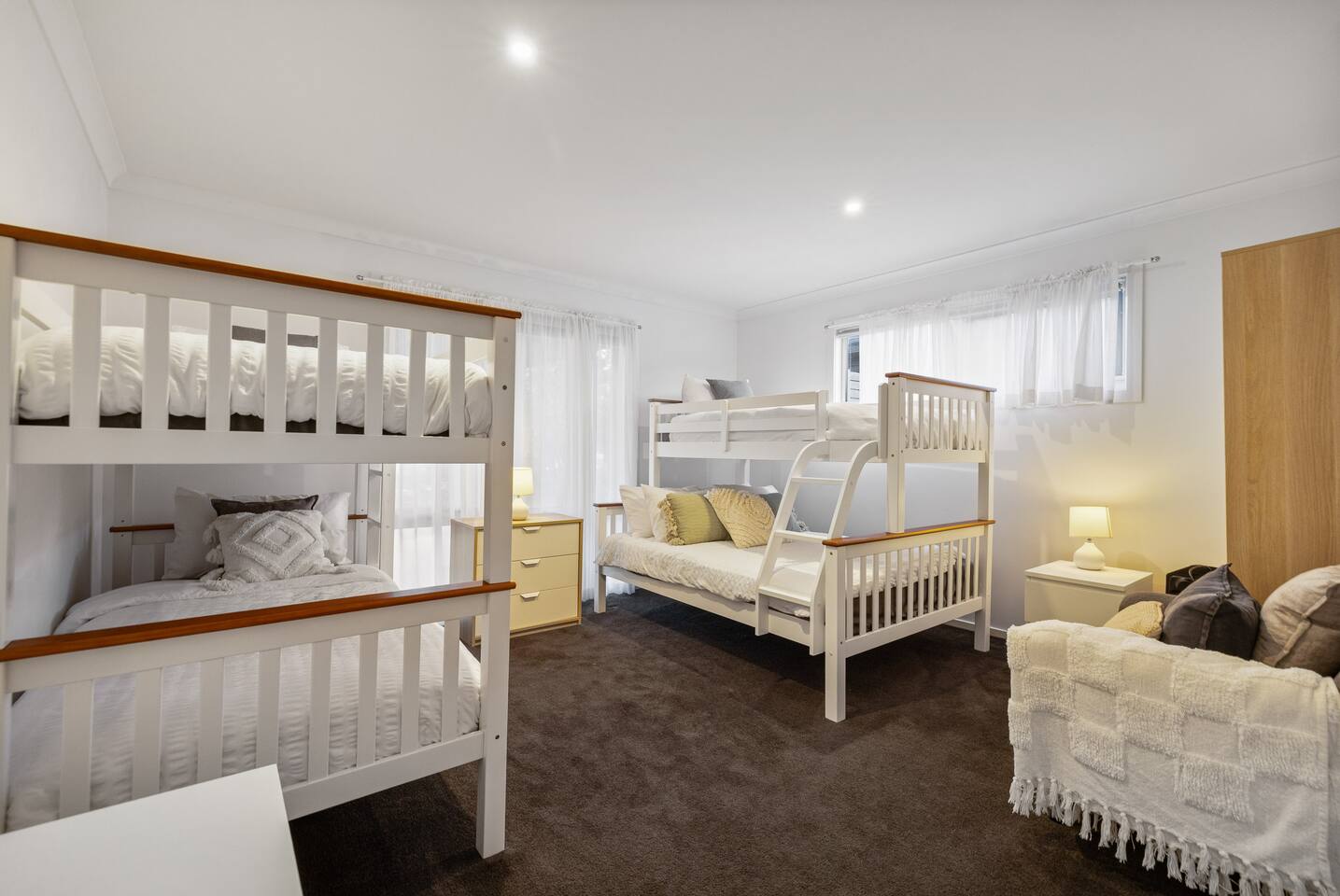 This home sleeps 11 people across four bedrooms. Bedroom 1: 1x Queen Bed (2 guests) Bedroom 2: 1x Queen Bed (2 guests) Bedroom 3: 2x King Single Beds (2 guests) Bedroom 4: 2x Tri-Bunk Bed and 1x King Single Bunk Bed (5 guests) Please note: Bedrooms 1, 2, and 3 are located upstairs, while Bedroom 4 is on the ground floor. All linens and towels will be included for your convenience. Lost or damaged hired linen/towels may incur costs. We kindly request that all guests clean the BBQ after use; otherwise, a $50 fee will be charged.