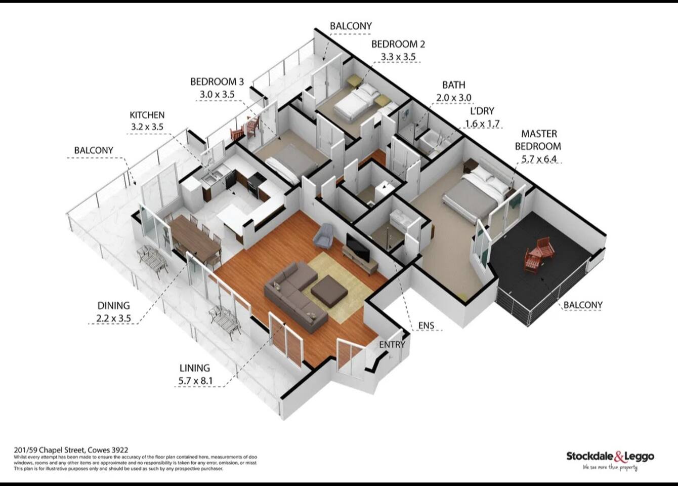 Located around the corner from the Cowes shops and beach is this beautifully presented 3 bedrooms, 2 bathroom apartment sleeping 6 guests comfortably.